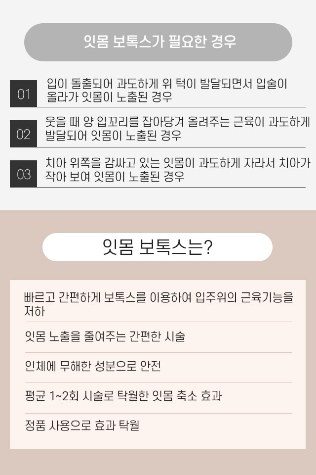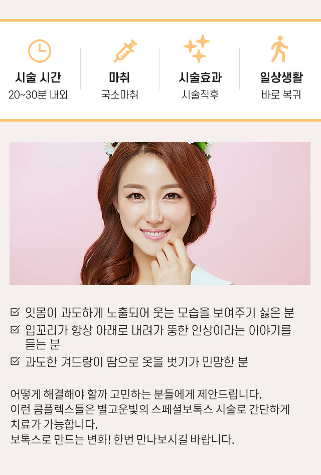 과도하게 노출된 잇몸, 미소가 없는 입매, 과도한 땀 모두 보톡스로 바뀌다별고운빛 스페셜보톡스