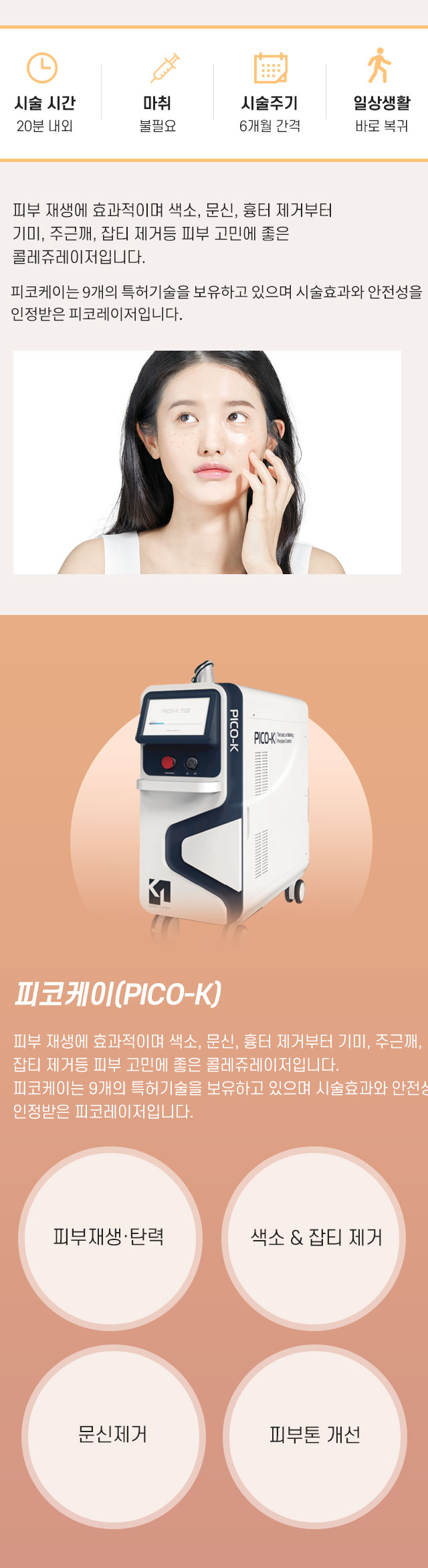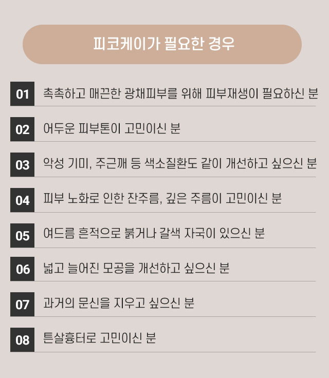 220개의 레이저 에너지가 깊숙이! 화사하고 탄력 넘치는 얼굴! 피코케이