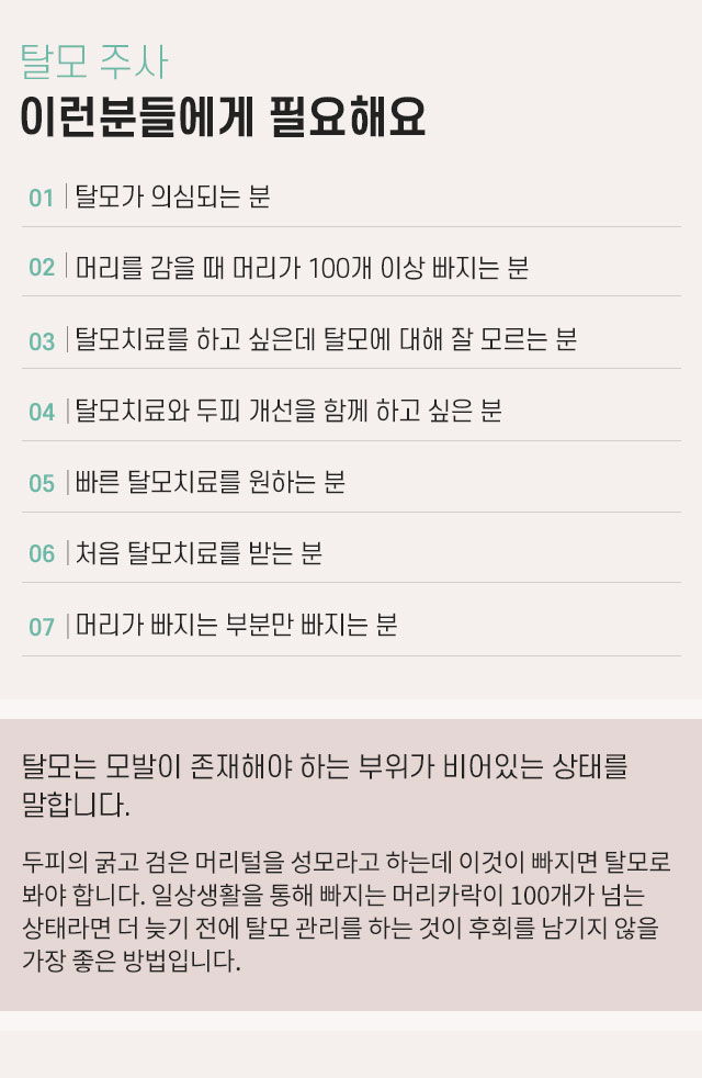 점점 가늘어지고 빠지는 머리카락원인, 증상 파악 후 맞춤 탈모주사를 시술하다.